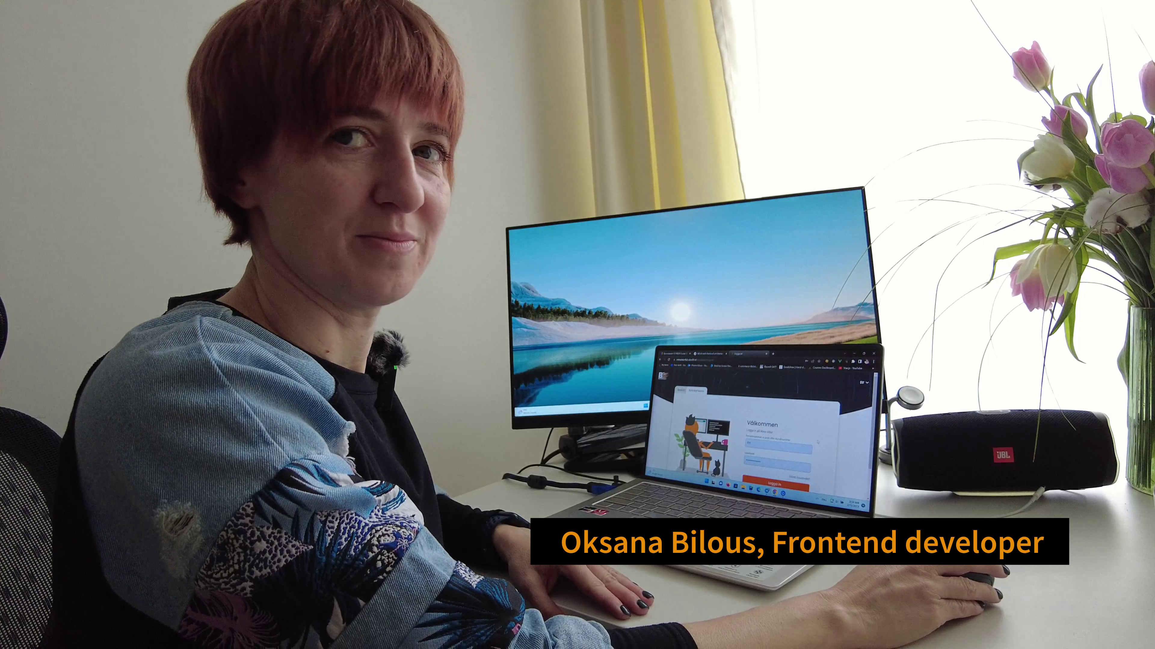 Det här är vår kollega Oksana. Vid inledningen av Rysslands fullskaliga attack fick hon möjligheten att evakueras till Sverige av Bahnhof. Men efter några månader valde hon att återvända till sitt hemland, där båda hennes bröder och hennes strider i försvaret.